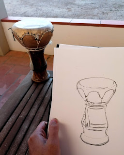Nota fnal: Deixamos ainda um segundo exemplo, neste caso um tambor, que tem mais algum detalhe comparativamente com a chávena de café. O processo é idêntico e aplica-se sempre nestes primeiros desenhos à vista, delinear a lápis pouco carregado as formas prncipais, traçar com lápis mais carregado a forma exterior e depois acrescentar os detalhes das zonas de sombras e padrões. Boa sorte!